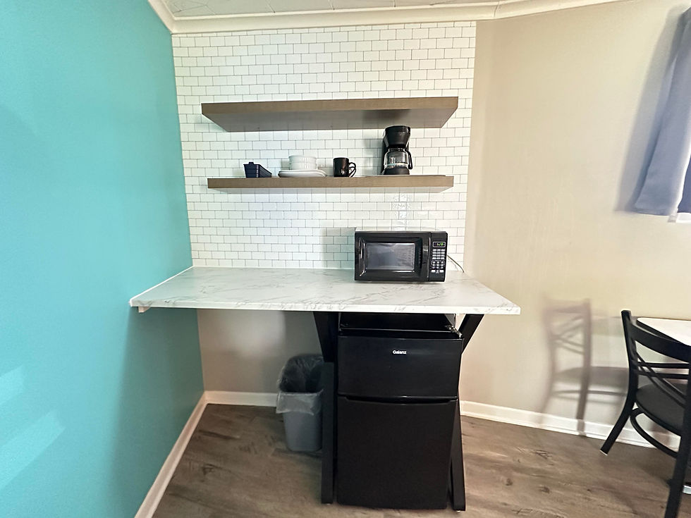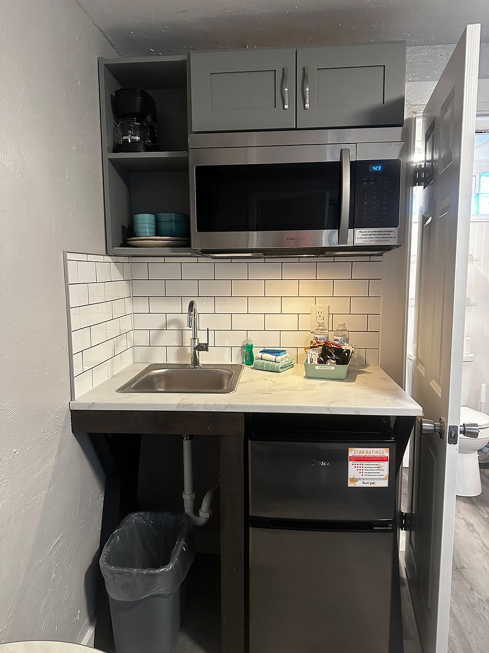 Kitchenette with mini fridge/freezer combo, full size microwave, sink, cabinets, & countertop area(no built-in cooktop).